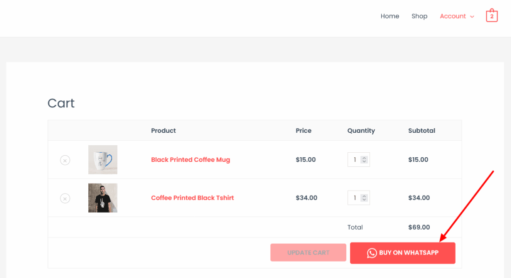 If you disable the Checkout page from the plugin settings, then on the Cart page you will see Buy on WhatsApp button instead of the traditional Proceed to Checkout button. Clicking on this button will redirect the customer to WhatsApp chat screen to the store admin with all the product details from the cart.