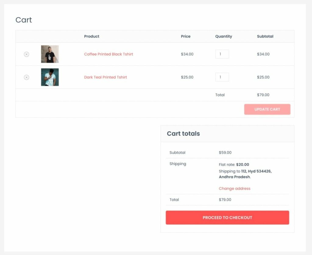 If you enable the “Checkout” page then the cart will be shows as the second image at right. This will now show the Proceed to Checkout button. Clicking on this button will take the customer to checkout page.