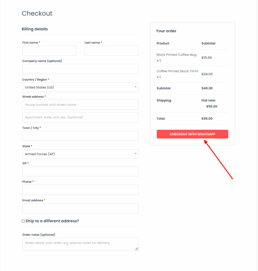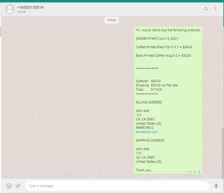 Finally, after filling the Billing details, the customer will click on the Checkout With WhatsApp button. Clicking on this button will take the customer to the WhatsApp chat screen to the admin whatsapp number with all the products details in the cart along with the customer name, phone and billing details.