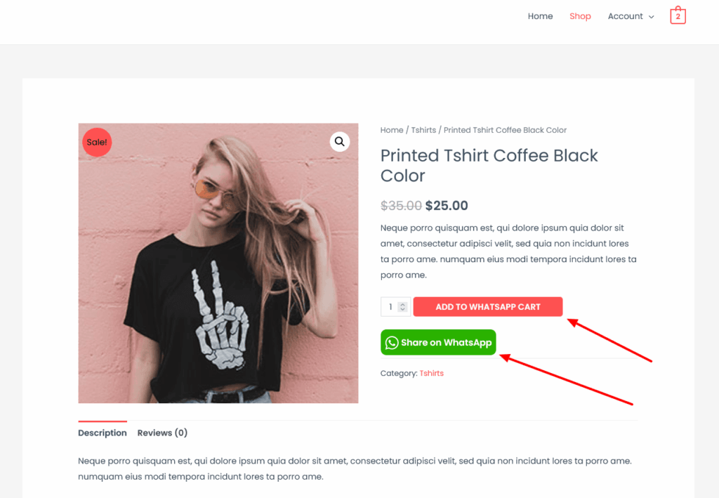 Your customers can also add the products to WhatsApp cart by clicking on Add to WhatsApp Cart button on the single product page. In addition to that, there is also another button called Share on WhatsApp. By clicking on this buttons, your customers can share about that product to their friends and family on WhatsApp.