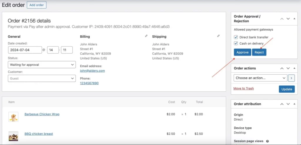 By navigating to Dashboard > WooCommerce > Orders, admin can Approve / Reject the order. After that an email with the order status will be sent to customers email. If order is approved, then the customer can complete the order with their preferred payment method from the store.