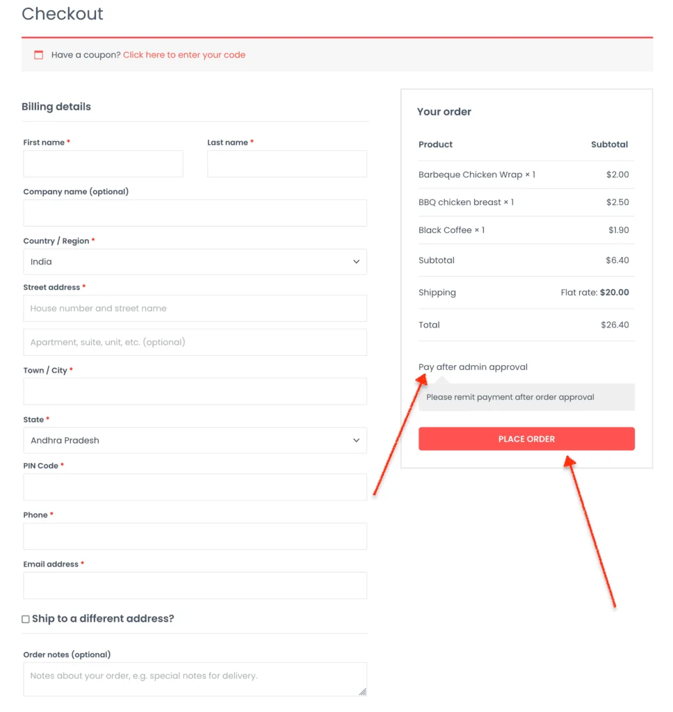 Once this plugin is installed and activated, a “Pay after admin approval” payment method will be displayed on the checkout page. Clicking on Place Order will create the order and redirects the user to the thank you page with order details.
