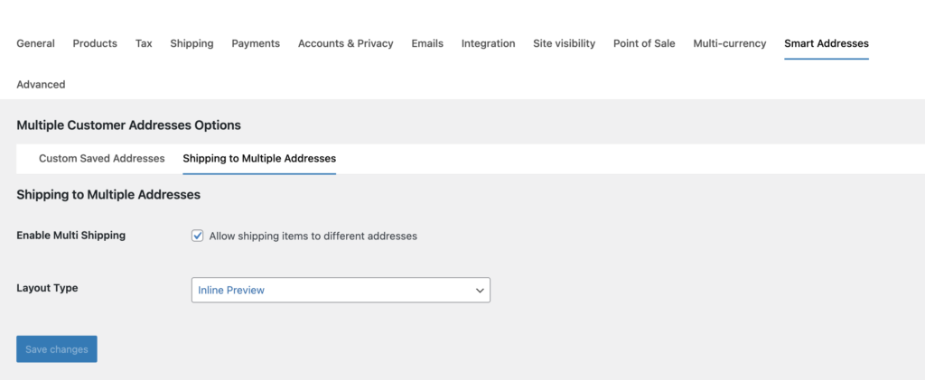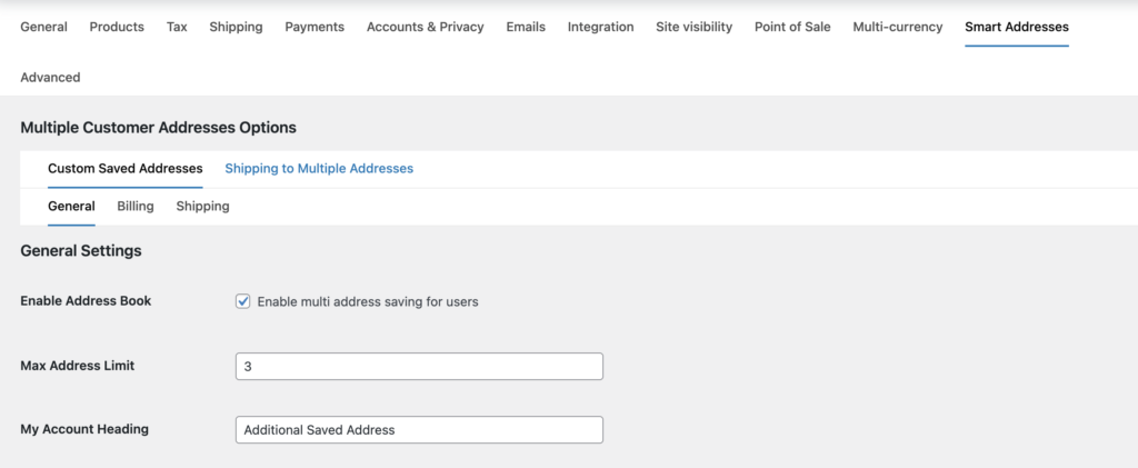 After installing and activating this plugin, a ‘Smart Addresses’ tab will appear in the WooCommerce admin settings panel, located similar to the image on the right side. For instructions on customizing these settings within the ‘Smart Addresses’ tab, refer to the documentation provided for the Smart Addresses for WooCommerce plugin.